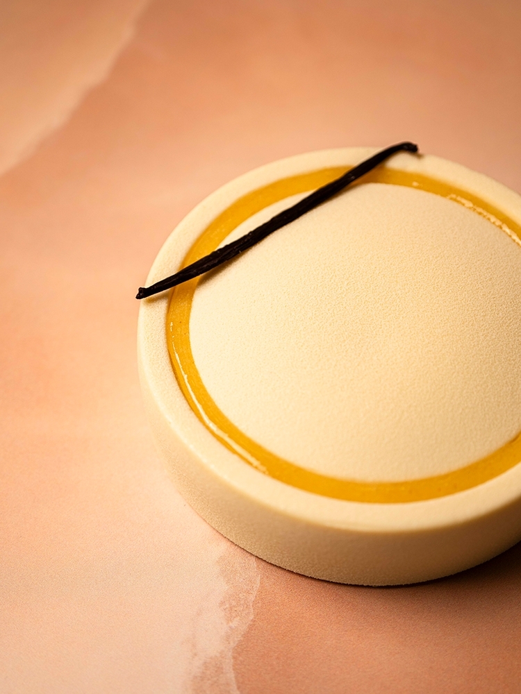 Crispy Speculoos biscuit, Madagascar vanilla Bavarian cream, ladyfinger biscuit, pear-vanilla confit.